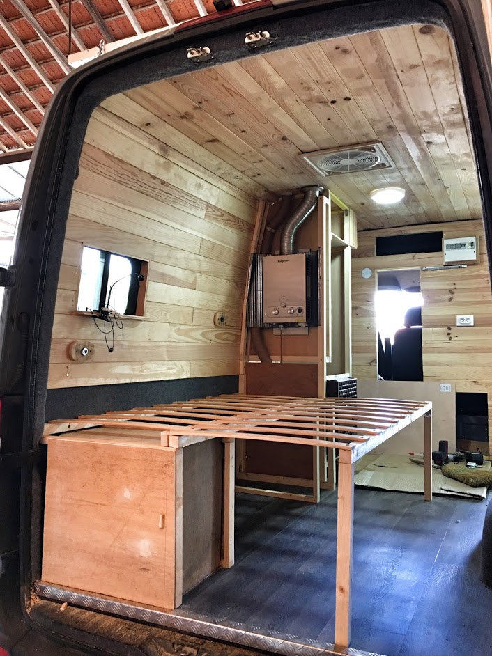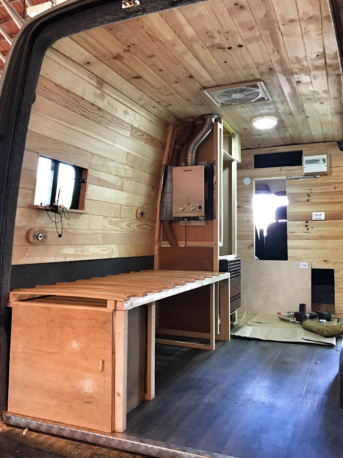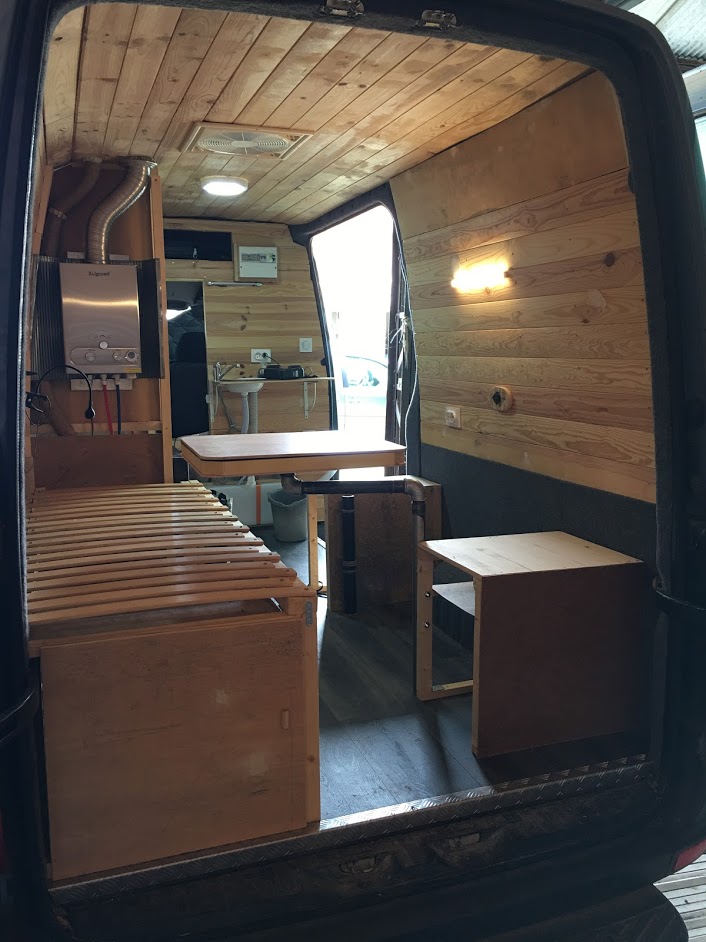 365 days after, lots of DIY weekends, screwed screws, hammered nails and help from my friends, it is still under construction but the essentials (electricity, gas and water) are all set up and I built myself a comfortable pullout bed.